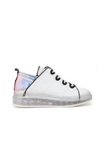 Leather sneakers with iridescent patent inserts and transparent sole.