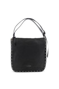 Soft faux leather bag with a distressed, faded effect and riveted edges. A metal logo and adjustable shoulder strap create a casual, edgy look.