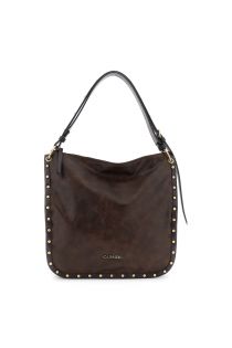 Soft faux leather bag with a distressed, faded effect and riveted edges. A metal logo and adjustable shoulder strap create a casual, edgy look.