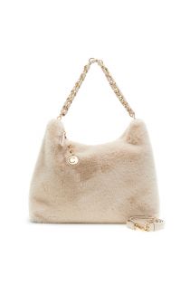 Soft faux fur bag with a chain handle and a metal charm featuring the Café Noir logo. Removable shoulder strap for versatile and elegant portability.