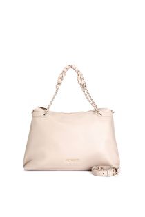 Soft shopping bag with threaded chain handles braided handle details with metal eyelets and removable shoulder strap. refined and functional style.