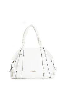 Soft shopping bag with zip fastening rolled up handle and decorative tulip-shaped pendant.