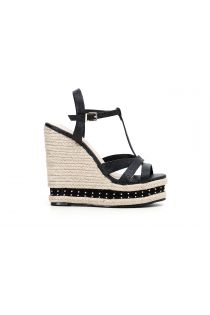Sandals with high braided cord wedge and front platform. Patent leather upper with T-shaped design and ankle strap.