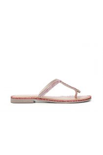 Split-toe sandals with ombré micro rhinestones and an unusual contrasting raffia thread along the perimeter of the leather insole.