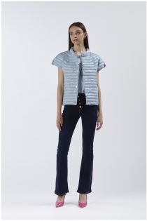 Spring down jacket with flap sleeves made of an impalpable nylon with a glossy finish. horizontal quilting button placket with logo snaps.