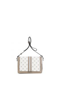 Stiff bag with long flap to be worn with an adjustable shoulder strap contrasting all-over logo print and vertical stripes in the centre of the flap.