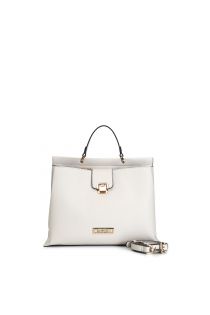 Stiff shopping bag made of saffiano-effect material with closing pod and small studded wallet bag.