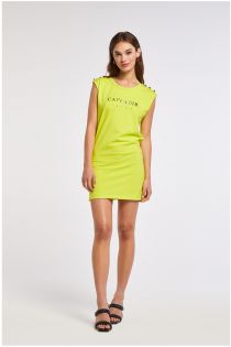 Stretch cotton sleeveless mini dress with printed logo and logo buttons creating a pattern on the shoulders