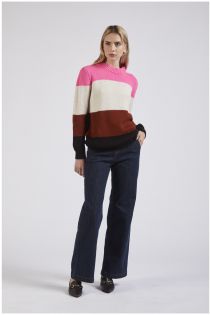 Wool-viscose yarn long-sleeved sweater with striped pattern.