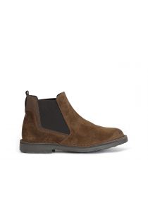 Men's suede ankle boot with side stretch panel and leather trim. upper stitched to the sole. leather insole.