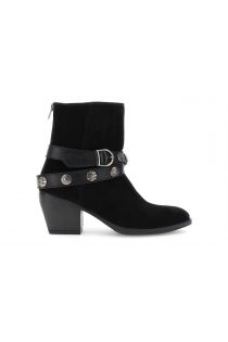Rock-and-roll suede ankle boot with double studded ankle strap and back zip. Bold details and a 7 cm block heel for a bold and irresistible style.