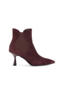 Suede ankle boots with asymmetrical elastic bands, leather insole, and 7.5 cm spool heel. Elegant and comfortable, perfect for feminine and trendy looks.