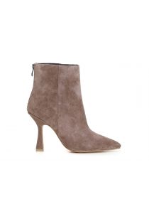 Suede ankle boots with asymmetrical high heel and tapered toe. Sexy and sophisticated, to embellish bold looks.