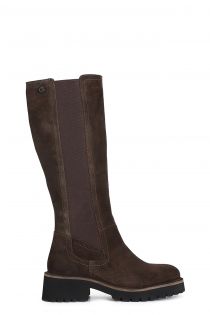 Suede leather boot with elastic bands with personalized stud. 50mm high heel. the insole is in leather.