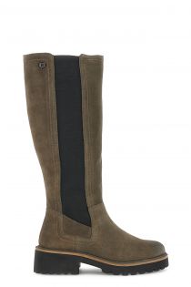 Suede leather boot with elastic bands with personalized stud. 50mm high heel. the insole is in leather.