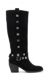 Suede boots with decorative metal buttons and a removable ankle strap. Leather lining and insole. A 7 cm block heel for a bold and assertive style.