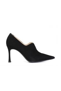 Suede décolleté with "v" cut. fine heel 87 mm high. slim shape. lining and insole are in leather. shoe with an elegant and feminine style.