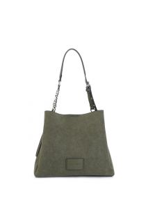 suede effect shoulder bag with large lettering on the shoulder strap oliva