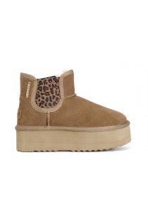 Suede ankle boot with spotted print stretch panels. faux fur lining and new 35mm high wedge sole.
