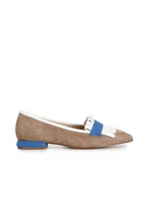 Suede loafers with decorative fringe. 15mm-high patent leather heel.