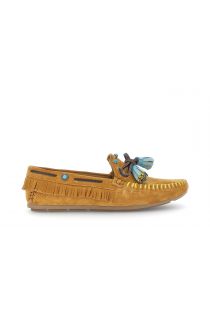 Suede moccasins with contrasting stitching a bow and colorful tassels. decorative studs leather lining and insole. a comfortable original boho-chic style.