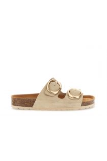 Slipper-style sandals with a double strap in soft suede embellished with large round gold buckles. the anatomical footbed ensures comfort and support all day long while the 3 cm cork and rubber sole ensures lightness and stability. perfect for a sophisticated casual look.
