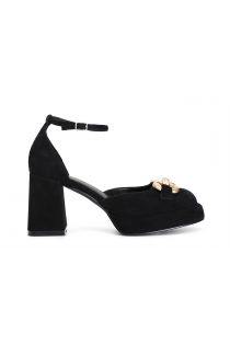 Suede court shoe with horsebit and ankle strap. 80mm heel and 20mm platform. the insole is leather. comfort and elegance at the same time and a unique character suitable for every outfit.