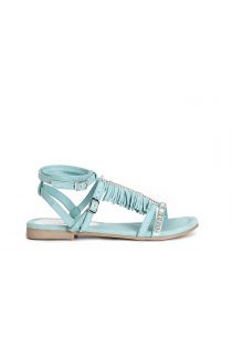 Suede sandals with fringed "t" motif and rhinestone chain. lining and insole are in leather. the heel is 2 cm high. comfortable to wear and easy to match.