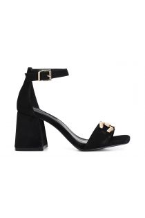 Suede sandals with gold accessory. reinforced heel in the back with adjustable buckle strap at the ankle. 70 mm-high heel.