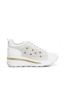 Suede sneakers with leather appliqués and stud and rhinestone feature. 40mm two-tone wedge sole with embossed logo.