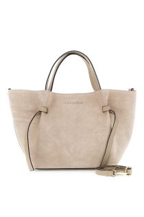 suede tote, unlined with internal pouch and removable shoulder strap powder