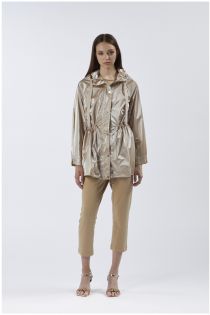 Comfort-fit parka with drawstring waist and hood. made of ultralight nylon with a super-shiny effect. the garment is unlined and long-sleeved.