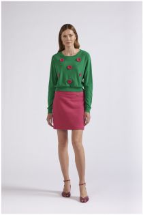 Crew-neck sweater with long sleeves. garment made of cotton and viscose blend yarn. crochet flower appliqué on the front.