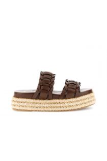 synthetic leather-effect sandal with two straps and raffia wedge dark brown
