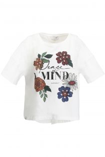 Short-sleeved t-shirt in stretch cotton jersey. floral print embellished with coloured rhinestones and glitter lettering. the model has a comfortable fit and a slit at the back.
