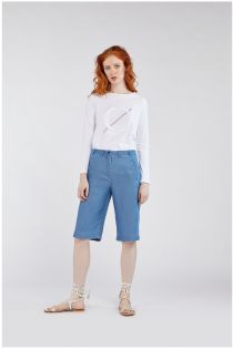 Straight leg bermuda shorts in denim-effect tencel. The garment has contrasting printed fabric features