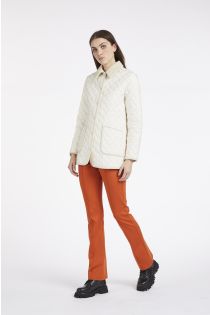 Quilted, Husky style down jacket, three-quarter length with velvet collar that matches the borders in the same material.