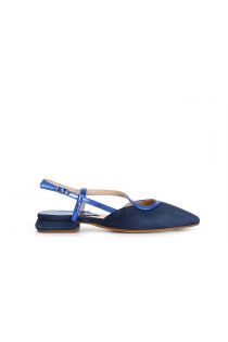 Two-tone-on-tone suede ballet flats with an ankle strap of laminated faux leather suede-faced heel.