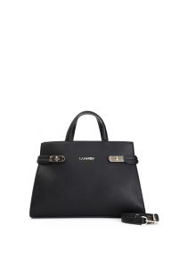Bag made of tumbled effect material and metal closures. bag to be carried by hand or with optional shoulder strap.