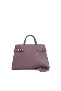 Bag made of tumbled effect material and metal closures. bag to be carried by hand or with optional shoulder strap.