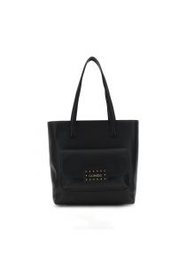 Shopping bag in synthetic material with front pocket with logo and rivet application. single internal compartment with zipped pocket.