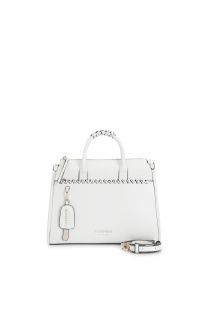 Women's tote with braided handles front pocket with threading detail and decorative charm. elegance and functionality for a sophisticated and practical look.