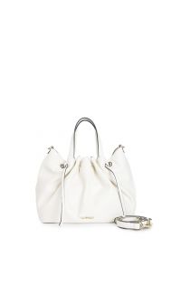 Soft handbag with metal bar for elegant folds decorative laces interior with zip. magnetic closure and metal lettering. removable shoulder strap.