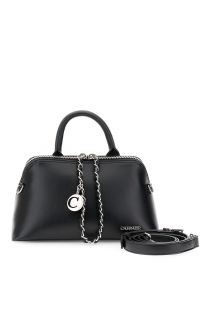 Trapezoid-shaped faux leather handbag with an exposed zip, decorative chain, and metal charm. Equipped with an adjustable, removable shoulder strap.