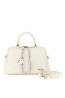 Trapezoid-shaped faux leather handbag with an exposed zip, decorative chain, and metal charm. Equipped with an adjustable, removable shoulder strap.