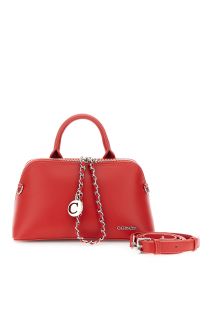 Trapezoid-shaped faux leather handbag with an exposed zip, decorative chain, and metal charm. Equipped with an adjustable, removable shoulder strap.