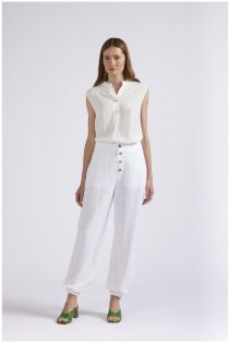 Trousers with visible buttons and elastic at the ankle made of a cool linen-blend fabric.
