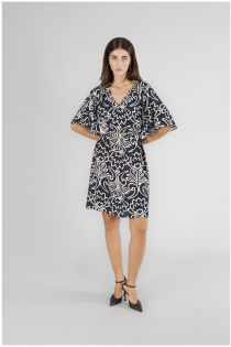 Knee-length dress with "v" neckline and sash with logo at the waist. wide sleeves. made of viscose marocaine with exclusive print. dress recommended for all day occasions and also perfect for office looks.