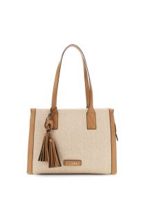 Tweed bag with contrasting leather-look details, tassel charm, and metal lettering patch. A flat back pocket and chic urban style.