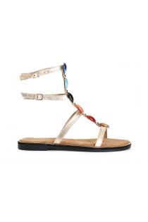 T-shaped flip-flop sandals in leather with decorated stones. lining and insole are in leather. shoe with a slightly rounded shape. the heel is 2.5 cm.